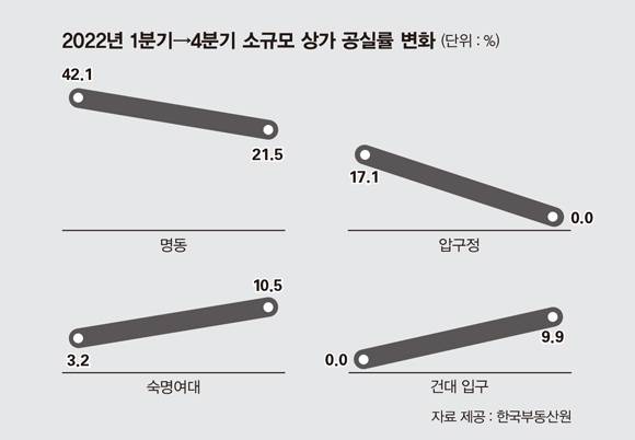 지난해 2분기 이후 사회적 거리두기 해제로 억눌렸던 소비심리가 분출된 영향은 대학 상권까지 미치지 않았다. 숙대(3.2%→10.5%)와 건대(0.0%→9.9%), 혜화동(대학로·0.6%→3.6%), 성신여대(2.4%→3.5%) 등의 소규모 상가 공실률은 지난해 1분기보다 4분기에 오히려 높아졌다. 명동(42.1%→21.5%), 광화문(12.7%→0.0%), 강남대로(22.0%→0.0%), 압구정(17.1%→0.0%) 등 다른 주요 상권 소규모 상가의 공실률이 드라마틱하게 내려간 것과 대비된다.