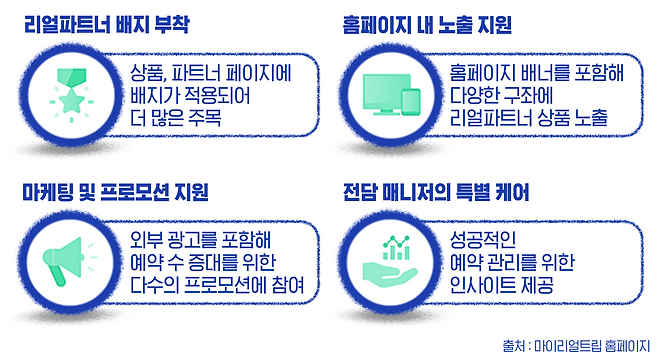 또한 마이리얼트립은 1년간 4회에 걸쳐 ‘리얼파트너’를 선정하는데, 이들은 1년간 고객의 만족도 평점 4.8 이상을 유지하고 있는 우수 파트너들로, 높은 예약 이행률과 빠르고 정확한 커뮤니케이션 스킬을 기준으로 한다. 이들은 마이리얼트립으로부터 마케팅 및 프로모션 지원, 홈페이지 내 노출 지원, 전담 매니저의 특별 케어 등의 혜택을 받아볼 수 있으며, 이러한 혜택들이 파트너 가이드들로 하여금 더 좋은 투어 상품을 제공하고자 노력하게 하는 요인이 된다.