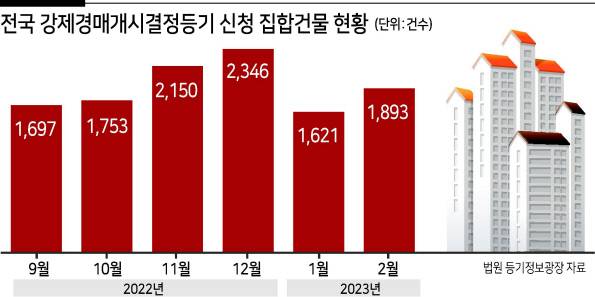 7일 법원 등기정보광장에 따르면 지난달 전국에서 강제 경매개시결정 등기가 신청된 집합건물(아파트·빌라·오피스텔 등)은 1893건으로 전월(1621건) 대비 16.8% 증가했다. 전국 집합건물 강제경매개시결정등기 신청 건수는 지난해 9월(1697건)부터 12월(2346건)까지 넉 달간 증가세를 보였다. 이후 올해 1월 들어 감소세로 돌아서는 듯 했지만 지난달 다시 증가세로 전환됐다.