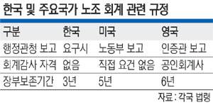 한국 노조의 회계 불투명성에 대한 비판이 커지고 있는 가운데 실제 주요 선진국들과 비교했을 때 △회계감사원 전문성·독립성 △재정 공개 범위 △조합원 정보 접근권 등에서 규정이 미비한 것으로 나타났다.