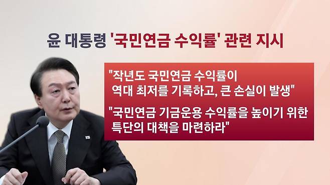 윤 대통령은 수석비서관 회의에서 제도적 차원의 국민연금 개혁뿐 아니라 기금 운용 수익률을 높이는 것도 중요한 개혁과제라고 강조했습니다.