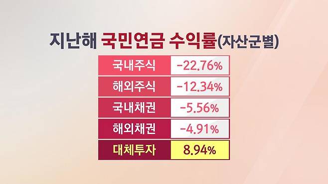 지난해 국민연금 수익률은 국내, 해외의 주식과 채권 수익률 모두 마이너스로 곤두박질쳤지만 대체투자만 9% 가까운 쏠쏠한 수익을 거뒀습니다.