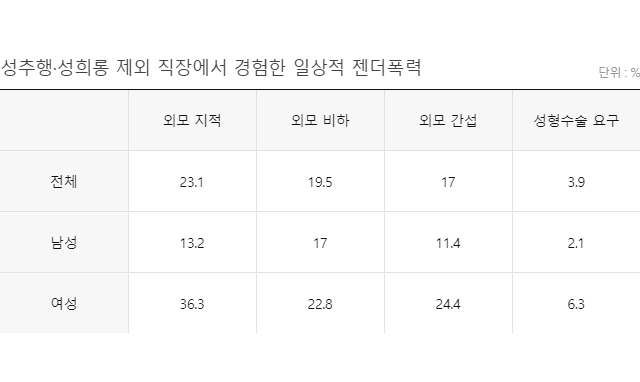 직장갑질119가 지난해 10월 직장인 1,000명을 대상으로 실시한 설문조사 결과에 따르면 성희롱·성추행을 제외한 일상 내 젠더폭력으로 가장 많은 것은 외모 지적(23.1%)이었다. 특히 여성은 36.3%가 피해 경험이 있다고 답했다. 여성들은 △외모 비하(22.8%) △외모 간섭(24.4%) △성형수술 요구(6.3%) 등을 받은 경험이 있다고 응답했는데, 이는 남성보다 1.3~3배 높은 수치였다.