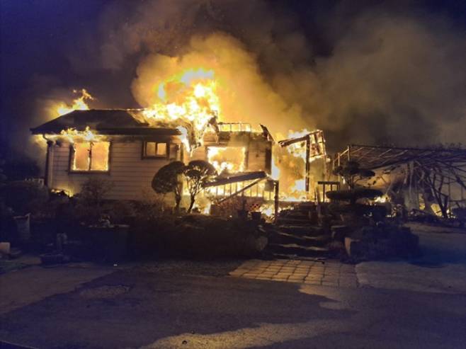 | 참사 현장 6일 오후 구조 작업을 하던 소방대원 등 2명이 숨진 전북 김제시 금산면의 한 주택 화재 현장에서 검은 연기와 화염이 뿜어져 나오고 있다. 전북소방본부 제공 |