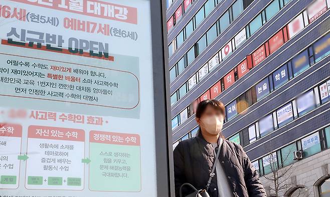 학원가는 성수기 7일 오전 서울 양천구 목동 학원가 앞을 한 시민이 지나가고 있다. 교육부와 통계청이 발표한 ‘2022년 초중고 사교육비 조사 결과’에 따르면 지난해 사교육비 총액은 25조9538억원으로 조사 이래 역대 최대치를 기록했다. 2021년도 23조4158억원보다 10.8% 늘어난 수치다. 뉴스1