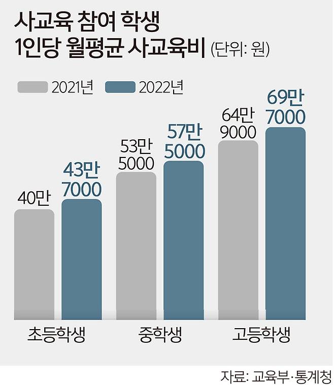 사교육 참여 학생의 월평균 사교육비는 △초등학생 43만7000원 △중학생 57만5000원 △고등학생 69만3000원으로 학교급이 올라갈수록 많았다. 하지만 전년 대비 증가 폭은 초등학생 9.2%, 중학생 7.4%, 고등학생 7.3%로 초등학생이 가장 가팔랐다.