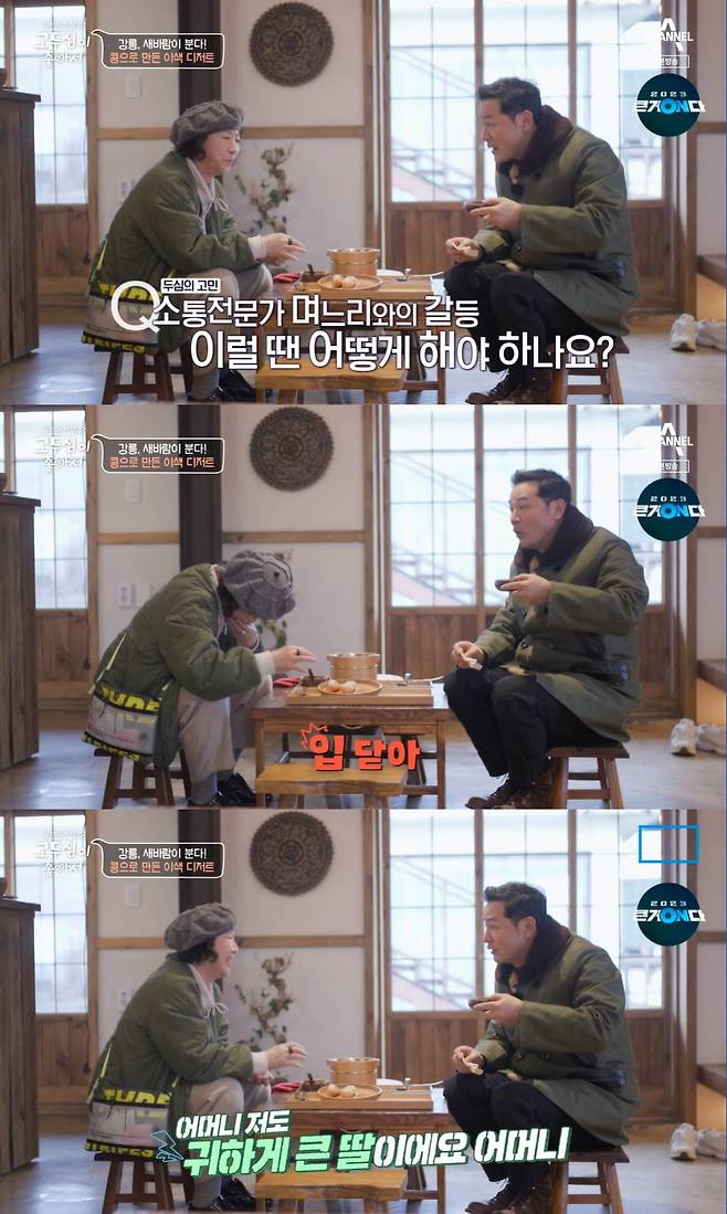 디저트를 맛있게 먹던 김창옥과 고두심은 갑자기 시어머니와 며느리로 상황극을 이어갔다. 김창옥이 "여기 닦아라, 저기 닦아라. 어머니, 제가 알아서 할게요"라고 대꾸하자, 고두심은 "입 좀 닫아라"라고 답하며 웃었다.