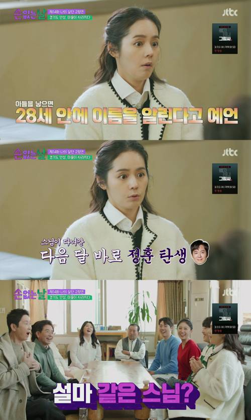 한가인은 이어 "그때 스님이 '이 집은 아들 하나 낳아야 하는데 왜 안 낳지?'라고 하셔서 어머님이 첫째만 낳고 안 낳으시려고 하셨기에 '아기 더 낳을 계획 없다'고 했더니 스님이 '아들을 낳으면 스물여덟 살 안에 이름을 알리는 애가 나온다'고 하셨다더라. 그리고 가시고 다음 달인가 바로 남편이 생겨가지고 낳았다고"라고 전해 놀라움을 안겼다.