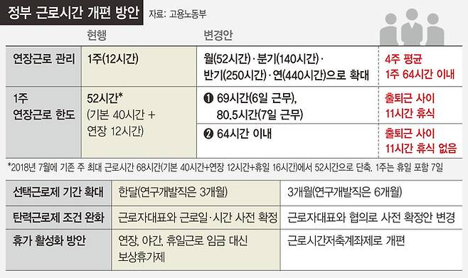 개편방안에 따른 한 주 최대 노동 시간을 설명할 때 흔히 주 최대 69시간을 이야기한다. 주 6일 근무를 전제한 것이다. 하지만 정부가 주 최대 노동 시간을 69시간으로 강조한 적은 없다. 연속 휴식 11시간, 4주 평균 64시간만 지킨다면 노동 시간에 제한을 두지 않는다. 정부가 꾸린 전문가 위원회인 ‘미래노동시장연구회’의 설명 과정에서 ‘주 6일, 69시간’이라는 숫자가 처음 등장했다.
