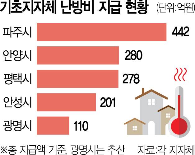 7일 서울경제의 확인 결과 파주시만 해도 이번 난방비 지원으로 총 442억 원의 재원을 사용한 것으로 나타났다. 평택시(278억 원), 안양시(280억 원), 안성시(201억 원), 광명시(110억 원) 등 서울에 인접한 경기 지역 시들 중 상당수도 300억 원 안팎의 예산을 난방비 지원 명목으로 집행했다. 지원을 검토 중인 화성시까지 포함할 경우 경기도 내 31개 시군 가운데 6곳이 모든 가구 혹은 개인을 대상으로 난방비 지원금을 지급하게 된다. 이들 지자체의 인구는 301만 명 정도로, 경기도 전체(약 1359만 명)의 약 22%에 이른다.