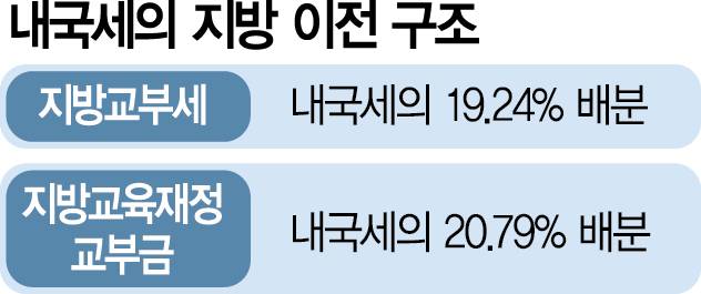 7일 기획재정부에 따르면 지난해 2차 추가경정예산 기준 지방교부세는 77조 원, 지방교육재정교부금은 76조 원이었다. 지난해 총수입(608조 3000억 원) 중 4분의 1 이상이 지방에 내려간 것이다. 중앙정부가 지자체에 분배하는 지방교부세는 내국세의 19.24%와 종합부동산세 전액으로 구성되며 17개 시도교육청에 주는 지방교육재정교부금은 내국세의 20.79%와 교육세 일부로 이뤄진다.