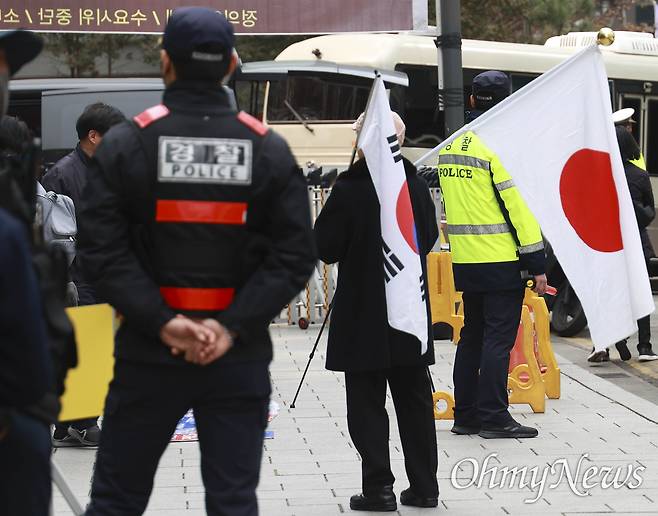 | ▲ 태극기와 일장기를 든 한 보수단체 회원이 8일 오후 서울 종로구 일본대사관앞 소녀상 부근에서 소녀상 철거, 수요시위 중단, 정의기억연대 해체 등을 요구하는 기자회견에 참석하고 있다. |