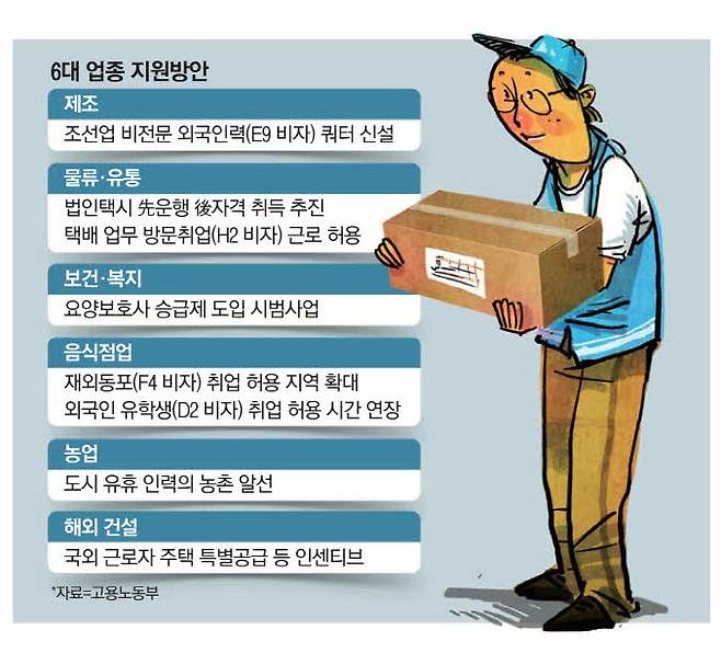물류·택배의 경우 작업자의 노동 강도를 완화하기 위해 자동화 설비 구축 지원을 확대하고, 인력난이 심한 분류 업무에 방문취업 동포(H2 비자)를 허용하는 방안을 검토한다. 해외 건설 분야에서는 해외 오지에 파견돼 장기간 근무한 근로자에게 주택 특별공급 기회를 부여하는 등 인센티브를 지원할 방침이다.