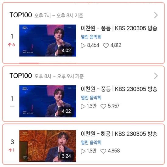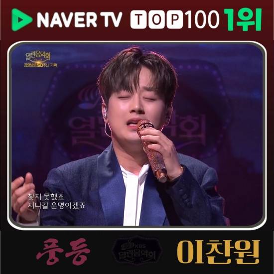 KBS '열린음악회'에서 이찬원이 선보인 '풍등' 무대가 네이버 TV TOP100에서 1위를 차지했다.
