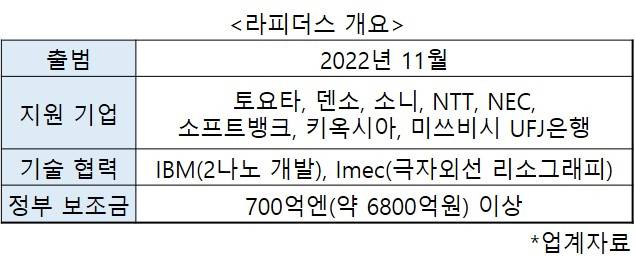 앞서 지난해 11월 중순 차세대 로직 반도체 국산화 양산을 목표로 한 반도체 신설기업 라피더스가 출범했다. 라피더스는 토요타자동차, 소니, 키옥시아 등 일본의 주요 기업 8곳이 출자한 신설법인이다. 2027년까지 슈퍼컴퓨터, 자율주행자동차, 인공지능 분야 등에서 활용되는 로직 반도체를 개발하는 것을 목표로 향후 10년간 5조엔(약 48조원)의 설비투자 등을 할 계획인 것으로 알려졌다. 일본 정부는 라피더스에 이미 700억엔(약 6800억원)을 지원하기로 결정했으며, 더 지속적으로 자금을 투입하겠다는 입장이다.