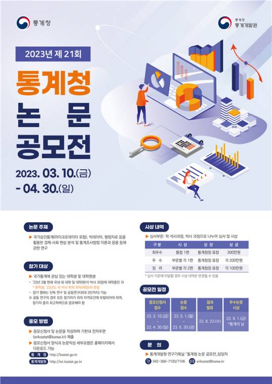 이번 공모전 주제는 국가승인통계·빅데이터·행정자료 등을 활용한 경제·사회 현상 분석 및 통계조사방법 이론과 응용이다. 이번 공모전에는 국내·외 대학 및 대학원(석·박사 과정)에 재학 중인 학생이라면 누구나 응모할 수 있다. 수상자에게는 통계청장 표창과 소정의 시상금이 주어진다. 올해 9월 개최될 ‘제13회 국가통계방법론 심포지엄’에서 포스터로 발표된다. 응모 신청은 오는 10일부터 다음달 30일까지며 응모신청자는 최종 논문을 6월 30일까지 제출해야 한다. 자세한 사항은 통계청 또는 통계개발원 홈페이지에서 확인할 수 있다.