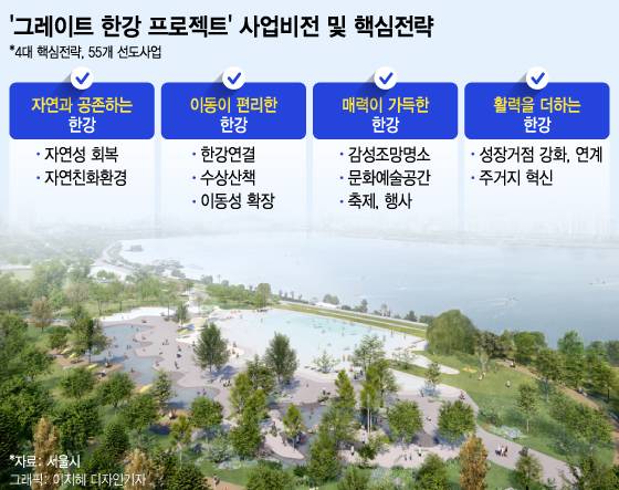 오 시장은 "한강의 매력과 가치를 제대로 발견하지 못하고 있다"고 진단한 뒤 "지난 15년간 변화된 사회와 트렌드를 반영하고 냉철한 분석으로 문제와 기회를 찾아내서 한강의 새로운 도약을 추구할 때가 됐다"며 "그레이트 한강 프로젝트가 서울 도시경쟁력 강화의 핵심이 될 것"이라고 자신했다.
