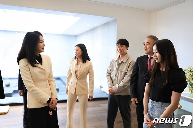 (서울=뉴스1) 오대일 기자 = 김건희 여사가 9일 열린 환경단체 대표 초청 오찬 간담회에서 참석자들과 대화하고 있다. (대통령실 제공) 2023.3.9/뉴스1
