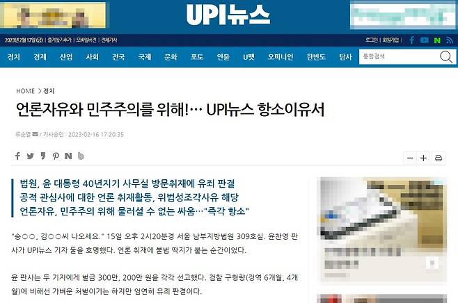 | ▲ 지난 2월 16일 UPI뉴스에 게재된 기사 '언론자유와 민주주의를 위해!… UPI뉴스 항소이유서'. 해당 기사는 류순열 편집인 이름으로 실렸다. |