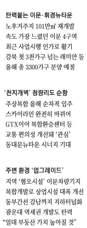 이문1·3·4구역과 휘경1·2·3구역 6개 구역을 합치면 1만2000여 가구에 이를 정도로 규모도 상당하다. 올해 이문1구역과 3구역, 휘경3구역이 일반분양을 앞두면서 '강북권 최대어'로 떠오르고 있다.