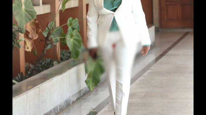 아프리카 케냐의 상원의원 오워바가 의회로 출근하고 있는데 흰색 정장 바지에 붉은 자국이 눈에 띕니다.