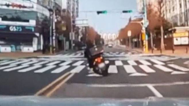 경남 진주의 한 도로, 배달 오토바이가 2차로에서 끼어들더니 갑자기 좌회전을 시도합니다.