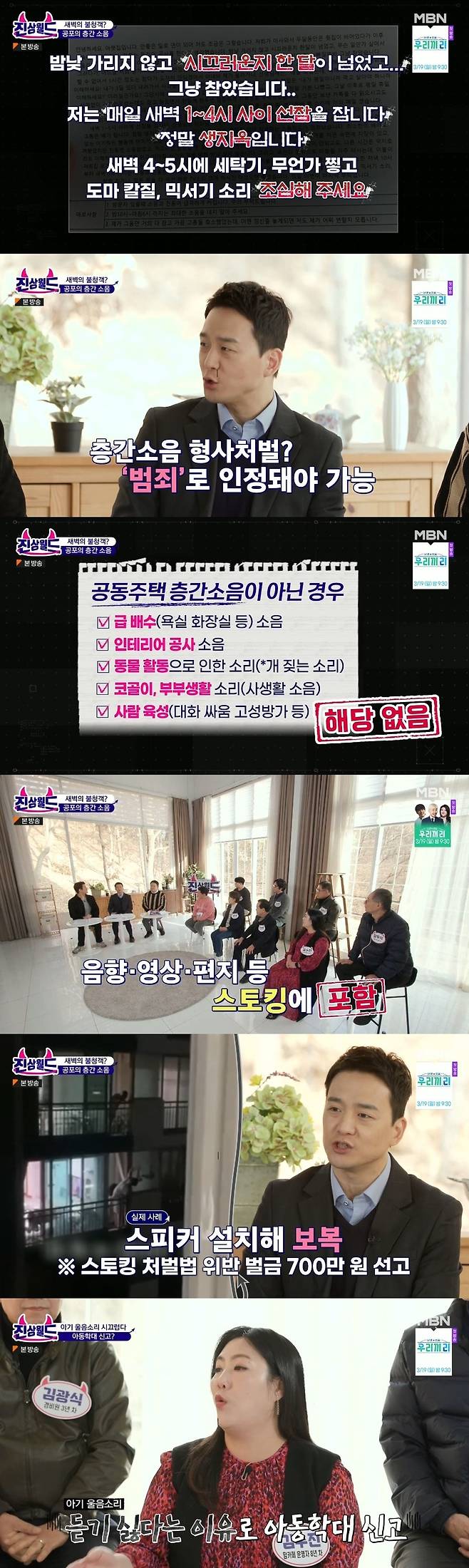 맘카페 운영 8년 차의 출연자는 신생아 울음 층간 소음으로 고통 받던 아랫집이 윗집에 대한 보복으로, 아동학대로 신고했다고 밝혀 충격을 줬다.