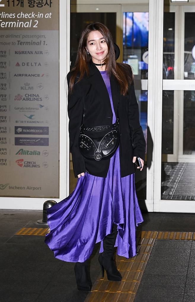 김성현 기자: 정말 이 의상으로 비행기를 탔을지 궁금해지는 코디. 지금 당장 브로드웨이 42번가로 뮤지컬을 보러 가야 할 것 같다. 반짝이는 보라색 원단은 카메라 플래시를 받아 더욱 과하게 보이고 위에 걸친 블랙 자켓은 답답함을 더한다.