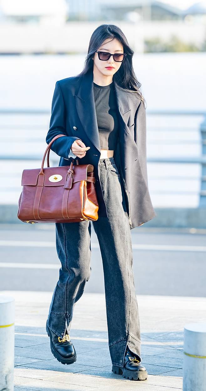 오지원 기자: 핏이 얼마나 스타일링을 좌우하는지 다시 한번 알게 됐다. 크롭 톱, 적당한 폭의 팬츠, 박시한 재킷까지 핏의 조화가 상당히 스타일리시함을 만들어냈다. 단조로울 수 있는 컬러에 무심한 듯한 가죽 빅 백이 좋은 포인트가 됐다.