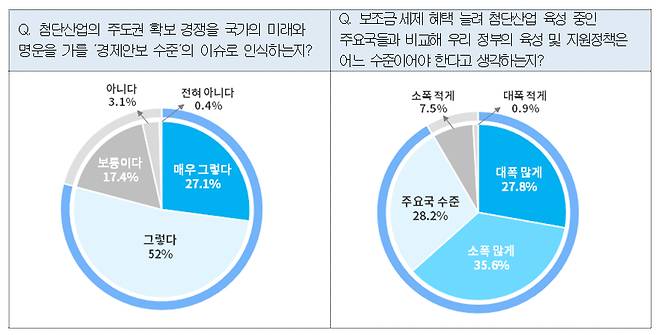 반도체와 전기차 등 첨단산업 육성정책을 바라보는 국민들의 눈높이가 한층 높아졌다. 국민 대다수가 글로벌 경쟁이 치열한 첨단기술 확보 전쟁을 경제안보 수준의 문제로 인식했고, 관련 육성정책이 다른 국가보다 우위에 있어야 한다고 생각했다. 반도체를 중심으로 한 미국의 기술패권이 심화되고 있는 가운데 정부와 국회가 국민의 목소리에 귀를 기울여야 한다는 지적이 나온다.