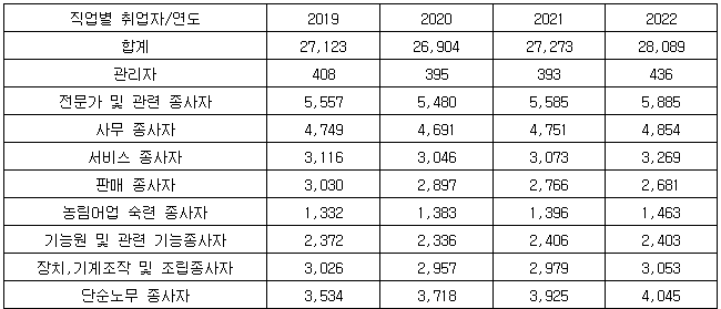 [표] 연도별 직업별 취업자 추이 (단위: 천명)