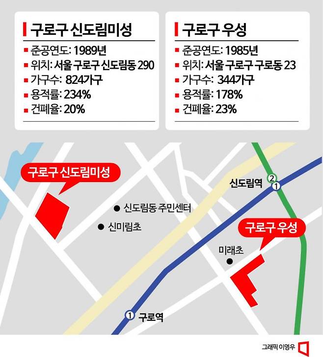 1985년 준공된 구로우성은 3개 동, 344가구 규모다. 평형은 51~109㎡(전용면적)으로 신도림역에서 500m 이내 거리에 있다. 현대백화점 디큐브시티점, 이마트 신도림점 등 생활 편의시설도 가까이 있다. 용적률은 178%다. 정비업계에선 용적률이 180% 미만이면 재건축 사업성이 있다고 본다.