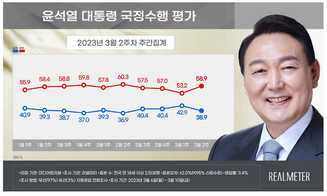 리얼미터가 미디어트리뷴 의뢰로 지난 6~10일 전국 만18세 이상 2508명에게 실시해 13일 공개한 3월 2주차 여론조사 결과, 윤 대통령 국정 수행 긍정 평가도는 38.9%로 조사됐다. 같은 기관 조사 기준 긍정 평가도가 40% 밑으로 떨어진 것은 2월 2주차(2월6~10일)에서 36.9%를 기록한 이후 4주 만이다. 같은 기관 조사에서 윤 대통령 긍정 평가도는 2월 3주차에 40.4%로 반등했으나 이번 조사에서는 전주 대비 4.0%포인트가 떨어졌다.