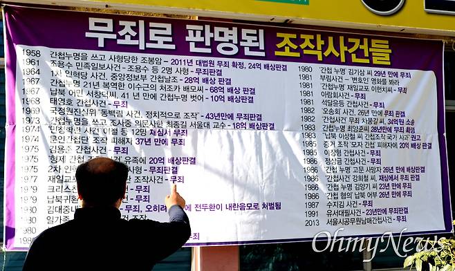 | ▲ 국가정보원, 경찰, 검찰이 최근 국가보안법 위반 혐의 사건에 대해 압수수색과 구속, 수사를 벌이고 있는 가운데, 민주노총 경남본부 건물 외벽에 "무죄로 판명된 조작사건들"이라고 새겨진 펼침막이 걸려 있다. |
