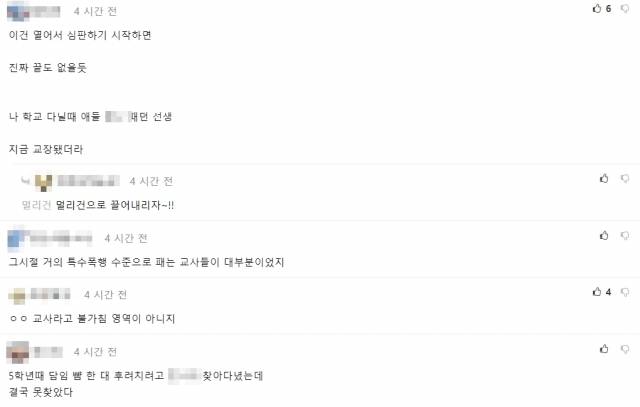 또 “이건(교사 폭력) 열어서 심판하기 시작하면 끝도 없을 것” “교사라고 (폭로의) 불가침 대상은 아니다”라며 논란의 확산을 예고하는 글들도 보였다.