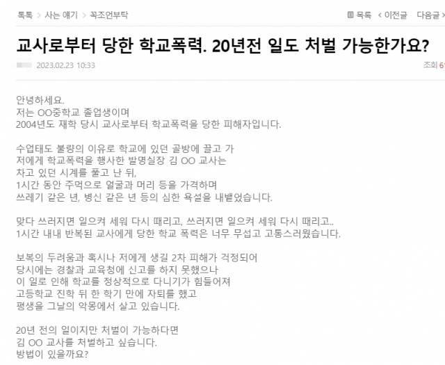 최근 한 온라인 커뮤니티에는 ‘교사로부터 당한 학교폭력, 20년 전 일도 처벌 가능한가요?’라는 제목의 글이 올라왔다.