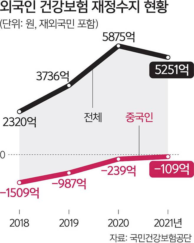 우리 건강보험에 가입한 중국인의 건보 재정 적자 규모가 3년 새 1400억원가량 줄어든 것으로 나타났다. 외국인 건보 가입자 중 유일하게 중국인만 낸 보험료보다 받은 급여 혜택이 더 컸는데 그 규모가 크게 감소한 것이다.