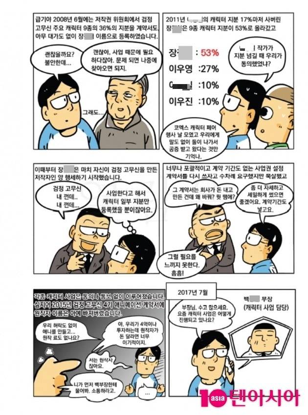 "너무나 포괄적이고 계약 기간도 없는 사업권설정계약서를 다시 쓰자고 수차례 요구했지만 묵살했고, 각종 캐릭터 사업은 동의나 통보 없이 이루어졌습니다. 심지어 2015년 검정고무신 4기 애니메이션 계약서에 원작자 이름은 아예 빠져버렸습니다."