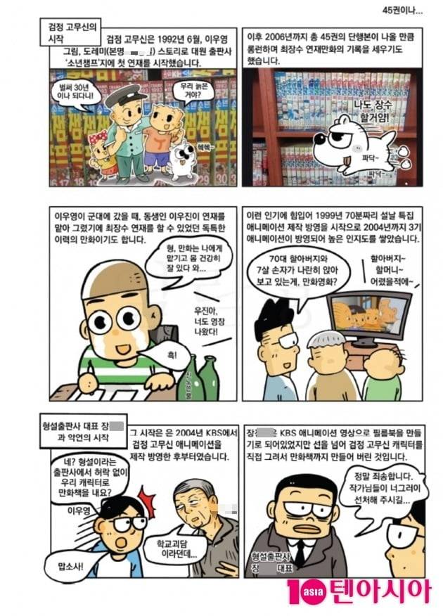 텐아시아는 '검정고무신' 분쟁배경에 관한 사실확인서를 입수했다. 이우영 작가와 형설의 소송이 길어지면서 이우영 작가가 2020년 만화로 낸 증거 서류다.
