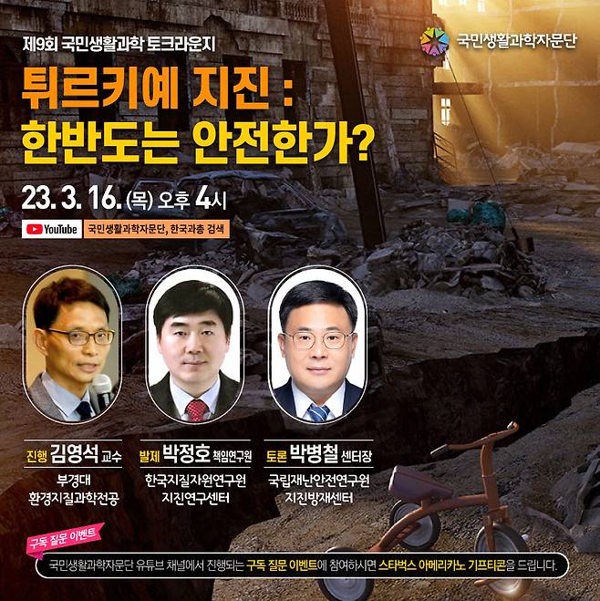 한국과학기술단체총연합회(회장 이태식)는 국가과학기술연구회(NST), 한국과학기술한림원, 한국과학창의재단, 한국과학기자협회와 공동 참여하는 국민생활과학자문단(단장 정진호 서울대 명예교수)이 16일 오후 4시, '튀르키예 지진: 한반도는 안전한가?'를 주제로 '제9회 국민생활과학 토크라운지'를 온라인 개최한다.