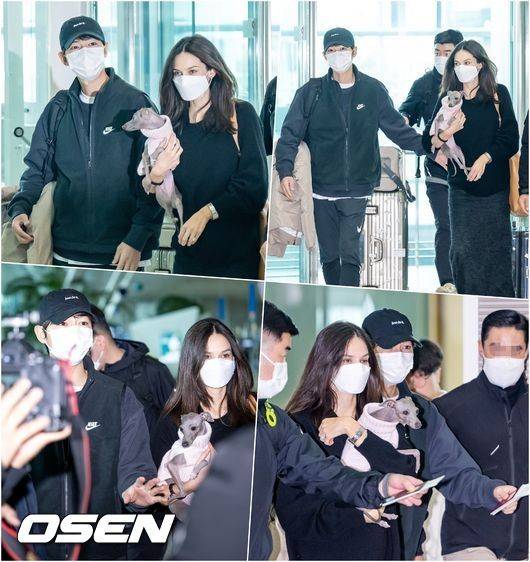 송중기는 지난달 16일 넷플릭스 영화 '로기완' 해외 로케이션 촬영차 인천국제공항을 통해 헝가리로 출국했다. 그의 곁에는 관계자는 물론 아내 케이티 루이스 사운더스와 반려견, 배 속 아이까지 있었다. 공개 연애 전에도 함께 공항 스케줄을 소화했던 송중기는 이젠 더욱 당당하게 아내를 케어했다.