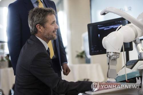 epa10522368 Denmark's Crown Prince Frederik inspects an automated arthritis scanning robot from Ropca during a visit to the European Robotics Forum 2023 (ERF2023) in Odense, Denmark, 14 March 2023. Some 900 scientists and industry leaders from 30 countries meet in Odense at Europe's largest robotics conference from 14 to 16 March 2023. EPA/TIM KILDEBORG JENSEN DENMARK OUT