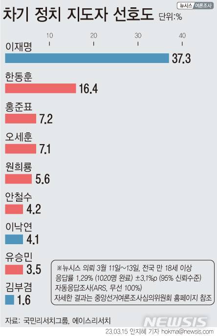 뉴시스가 여론조사 전문기관 국민리서치그룹과 에이스리서치에 의뢰해 지난 11~23일 전국 만 18세 이상 남녀 1020명을 대상으로 '향후 우리나라를 이끌 차기 지도자 적합도'를 물은 결과, 이재명 대표가 37.3%로 1위를 차지했다. 한동훈 장관은 16.4%로 2위를 달렸다.