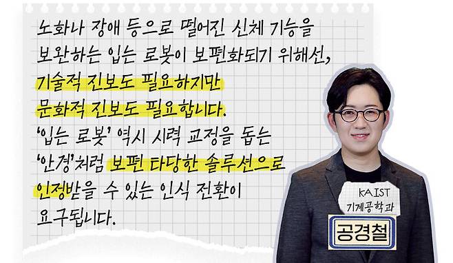 우리 몸의 기계장치들을 보호하기 위하여 각종 영양제와 건강식품이 개발되었지만, 윤활유를 뿌려서 기계장치를 보호하는 데에는 한계가 있기 마련이다. 그래서 개발된 웨어러블 로봇. 우리 몸의 순정부품을 보호하기 위해 만들어진 기술들 가운데 가장 완벽한 솔루션이다. 웨어러블 로봇은 원래 장애인을 위해 처음 개발되었다고 한다. 그런데 지금은 누구나 매일 그냥 입는다. 마치, 검게 그을린 피부를 보호하려고 개발한 선크림을 로션과 함께 매일 바르게 된 것처럼, 이제는 아픈 곳 하나 없더라도 매일 로봇을 입는 세상이다.