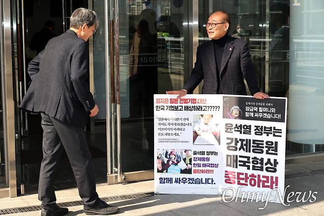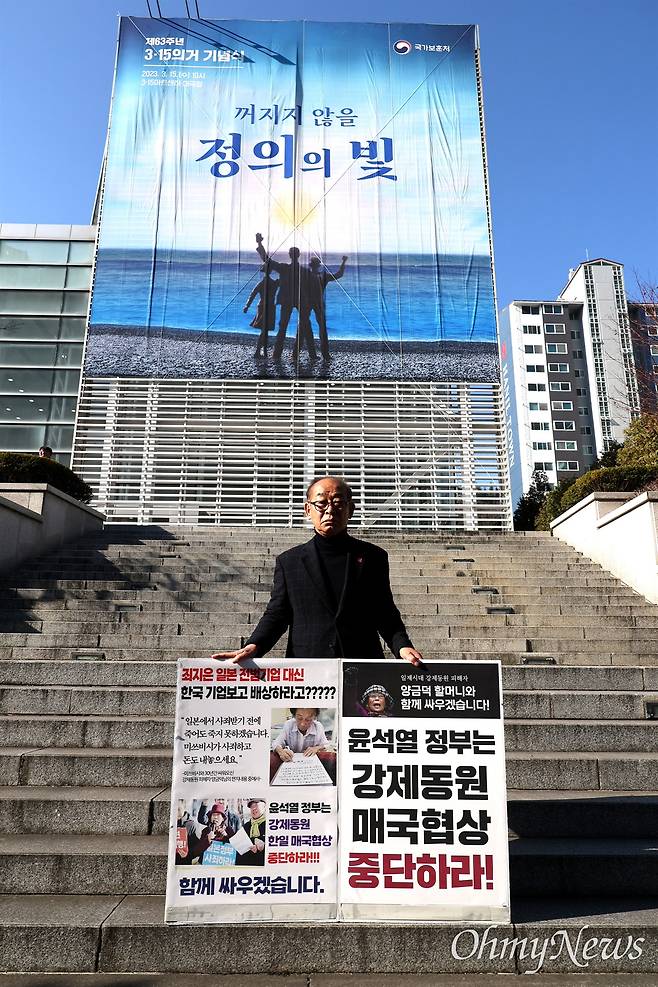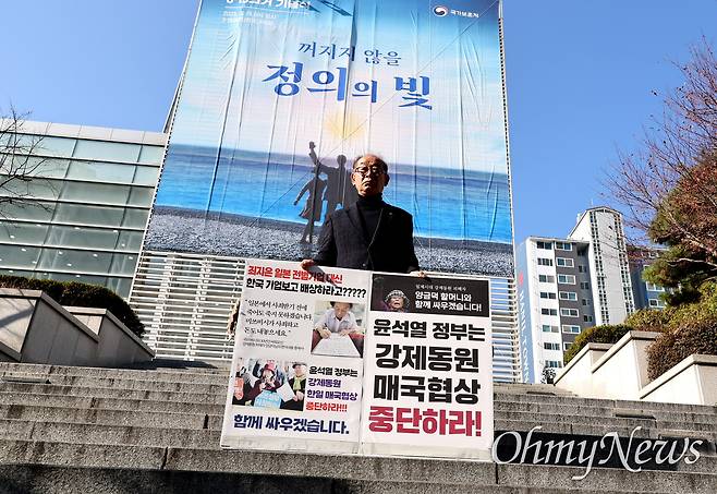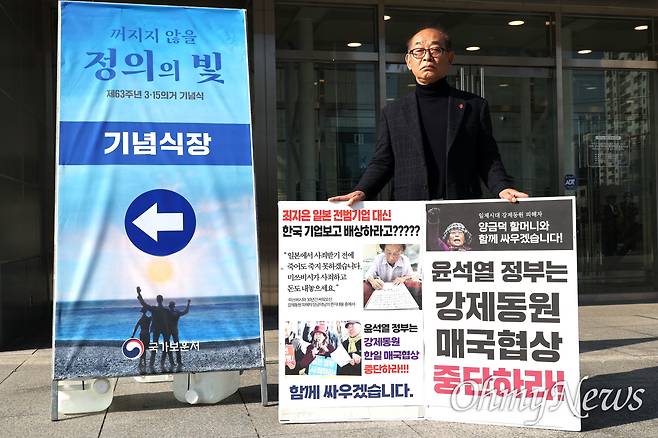 김영만(79) 김주열열사기념사업회 고문이 15일 아침 창원마산 3·15아트센터 앞에서 "윤석열 정부는 강제동원 매국협상 중단하라"고 쓴 팻말을 들고 1인시위를 벌였다.
