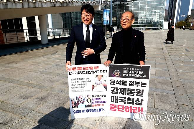 | ▲ 김영만 김주열열사기념사업회 고문이 15일 아침 3.15아트센터 앞에서 "윤석열 정부는 강제동원 매국협상 중단하라"고 쓴 팻말을 들고 1인시위를 벌였다. 왼쪽은 이우완 창원시의원. |