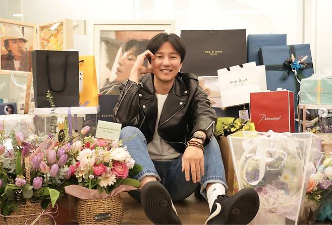 공개된 사진 속 김남길은 팬들이 보내준 선물과 꽃다발 사이에 앉아 포즈를 취하고 있다.