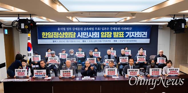 | ▲ 한일역사정의평화행동 회원들이 15일 오전 서울 중구 프레스센터에서 열린 한일정상회담에 대한 시민사회입장 발표 기자회견을 열고 있다. |