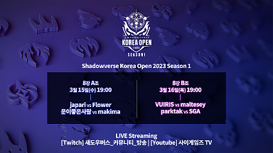 '섀도우버스 코리아 오픈 2023 시즌 1'의 본선은 3전 2선승제 더블 엘리미네이션 토너먼트 방식으로 진행되며 15일 19시 8강 A조 경기를 시작으로 16일 8강 B조 경기가 진행된다.