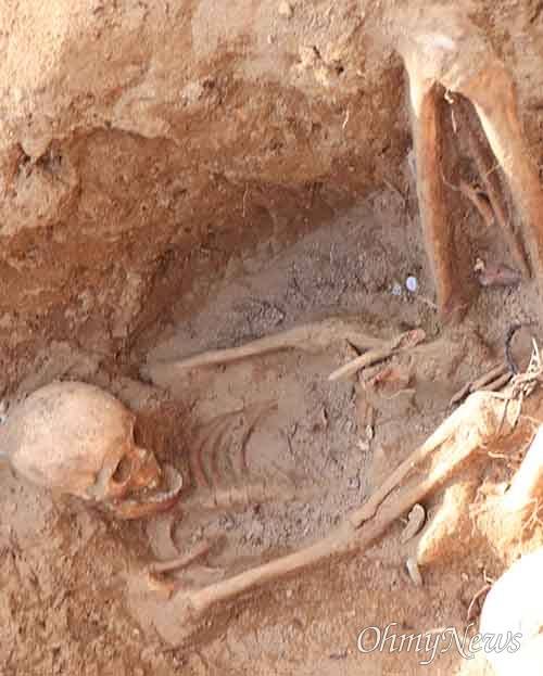 유해는 'ㄴ'자 형태로 심하게 꺾여 있었다. 구덩이(방공호) 안에 몰아넣은 후 살해했거나, 살해 후 구덩이 안으로 아무렇게나 집어던진 것으로 짐작됐다. 나머지 유해들도 아무렇게나 뒤엉켜 있었다. 대부분은 엎드려 있는 자세로 얼굴이 드러난 유해는 많지 않았다.